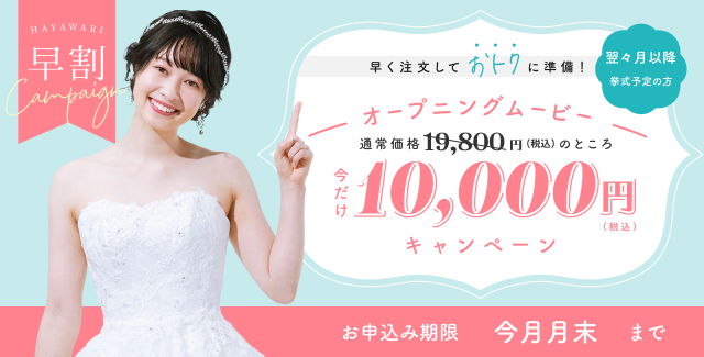 早めの注文でオープニングムービーをお得に購入できるクーポンがこちら。19,800円(税込)のオープニングムービーが10,000円(税込)となり、なんと9,800円もお得に!