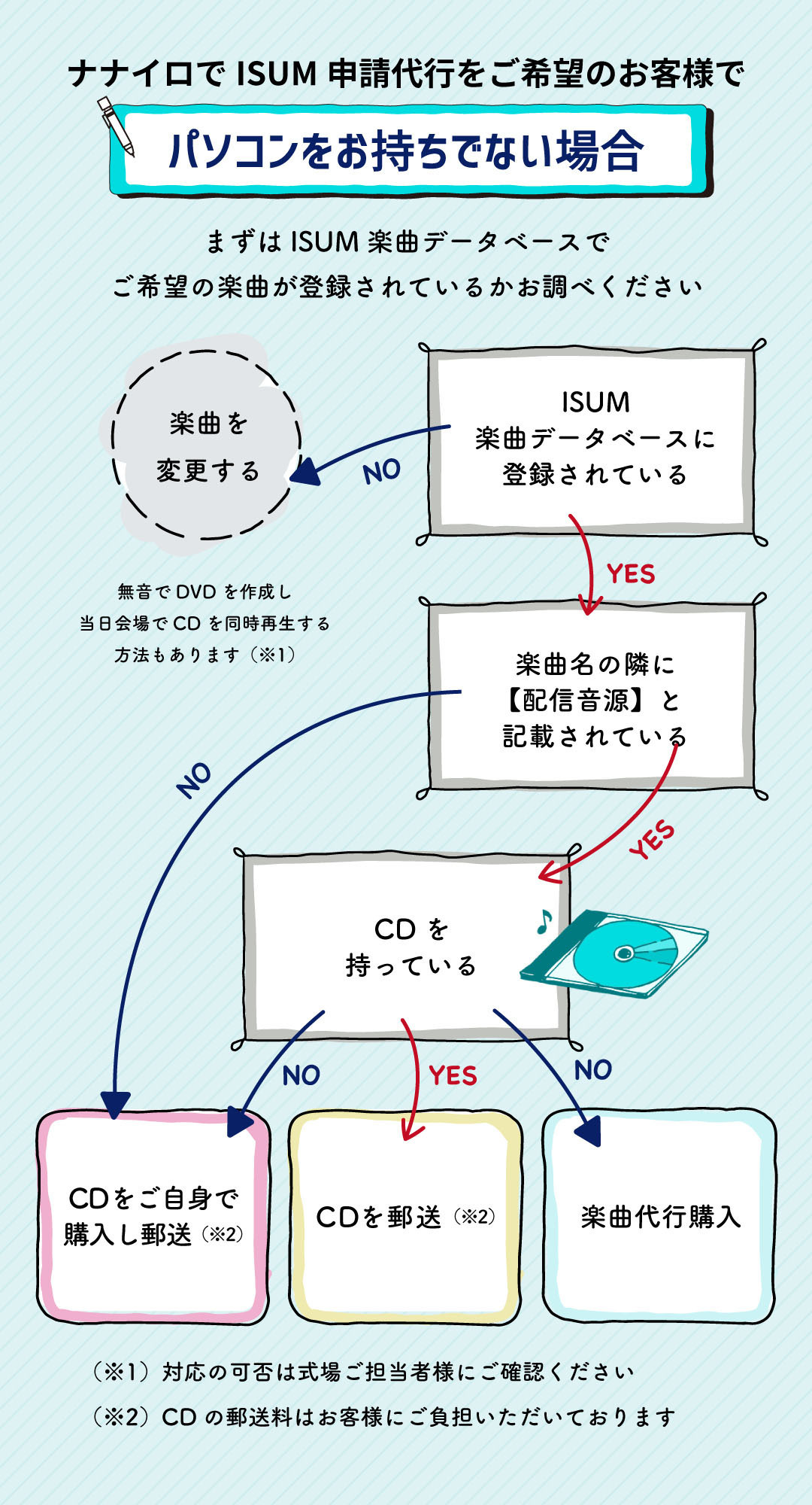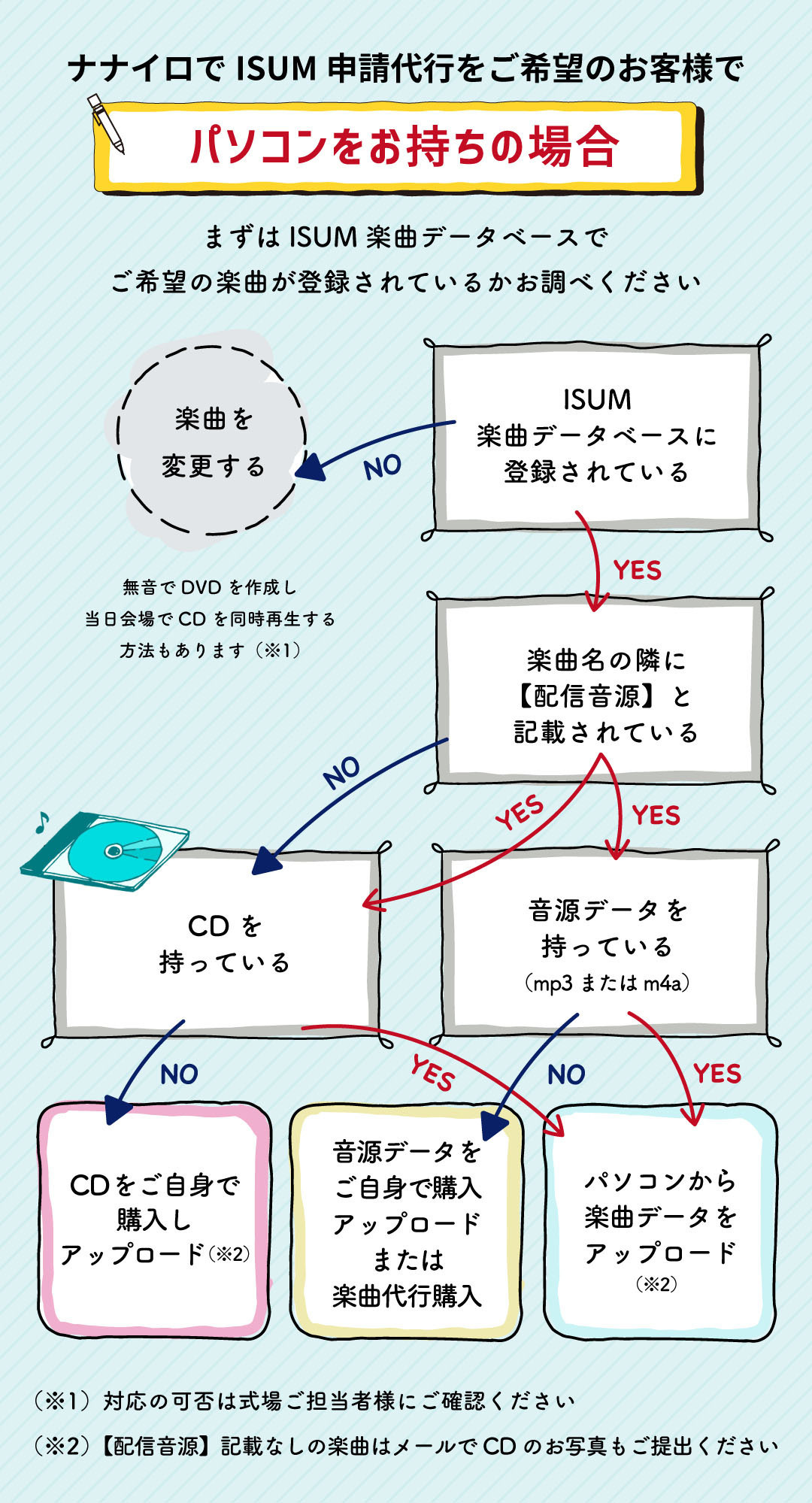 また音源はパソコンからのみマイページ上にアップロードが可能ですので、パソコンをお持ちでない場合はチャート②で必要なお手続きのご確認をお願いします。