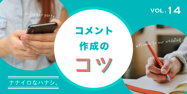 こんにちは!「ナナイロなハナシ。」第14話は、結婚式ムービーで大切なコメントの書き方についてお送りします。コメント作成は「ムービ作成で時間がかかったこと」として、先輩カップルからもよくお聞きします。「なにを書いたらいいのかな?」「伝えたいことがありすぎてまとまらない!」など、みなさんのお悩みを解決すべく、読みやすい&ゲストに伝わりやすいコメントのポイントをご紹介します!