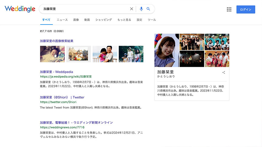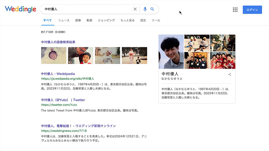 検索ボックスに新郎新婦それぞれのお名前を入力すると、検索結果には新郎新婦の生い立ち写真とプロフィールが表示されます。
